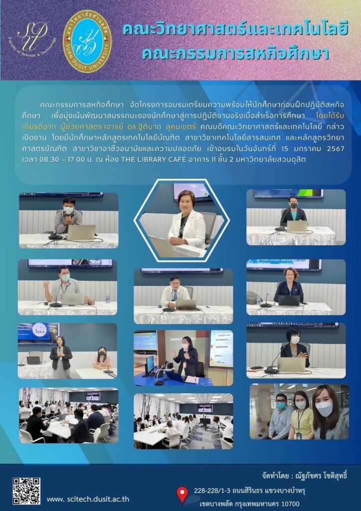 คณะกรรมการสหกิจศึกษา จัดโครงการอบรมเตรียมความพร้อมให้นักศึกษาก่อนฝึกปฏิบัติสหกิจ ศึกษาเพื่อมุ่งเน้นพัฒนาสมรรถนะของนักศึกษาสู่การปฏิบัติงานจริงเมื่อสำเร็จการศึกษา โดยได้รับเกียรติจาก ผู้ช่วยศาสตราจารย์ ดร.ฐิตินาด สุคนเขตร์ คณบดีคณะวิทยาศาสตร์และเทคโนโลยี กล่าวเปิดงาน โดยมีนักศึกษาหลักสูตรเทคโนโลยีบัณฑิต สาขาวิชาเทคโนโลยี่สารสนเทศ และหลักสูตรวิทยาศาสตรบัณฑิต สาขาวิชาอาชีวอนามัยและความปลอดภัย เข้าอบรมในวันจันทร์ที่ 15 มกราคม 2567 เวลา 08.30 – 17.00 น. ณ ห้อง THE LIBRARY CAFE อาคาร 11 ชั้น 2 มหาวิทยาลัยสวนดุสิต