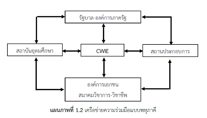 เมื่อการจัด CWIE ได้รับการยอมรับกว้างขวางขึ้นทั้งระดับรัฐบาล องค์การทั้งภาครัฐ เอกชนและชุมชน ระบบและกระบวนการจัด CWIE ก็ขยายตัวเป็นพหุภาคีจากเดิม ซึ่งเป็นทวิภาคีระหว่างสถาบันอุดมศึกษากับสถานประกอบการ ทำให้เกิดการบูรณาการการศึกษากับการทำงาน (Work-Integrated Education) ที่ร่วมกันจัดระหว่างสถาบันอุดมศึกษากับสถานประกอบการในลักษณะ ความร่วมมือ 4 ฝ่าย ประกอบด้วย ฝ่ายผู้จัด ได้แก่ สถาบันอุดมศึกษากับสถานประกอบการ ฝ่ายนโยบายและสนับสนุนการจัด ได้แก่ รัฐบาล หน่วยงานภาครัฐ องค์การเอกชน ชุมชน และสมาคมวิชาการและวิชาชีพ ดังแสดงไว้ในภาพต่อไปนี้
